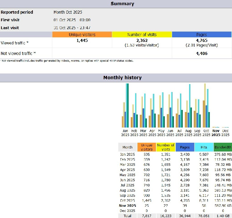Unique Visitors:- From a Corona Virus low of 228 in Feb 2021 we have steadily risen to 900 in Sept 2025 and in October to 1,445!! Germany is back in the lead for ‘pages read’ although they don’t stay long unlike Japan where the sudden rise in interest is backed up by staying longer on the website! USA although fewer pages read are on the website for much longer - bandwidth of 27.16MB which is comparable to Great Britain’s 34.43MB.