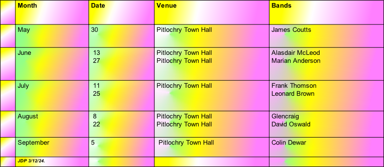 Summer dancing programmes are held during the summer months in Pitlochry Town Hall, Pitlochry, Scotland.